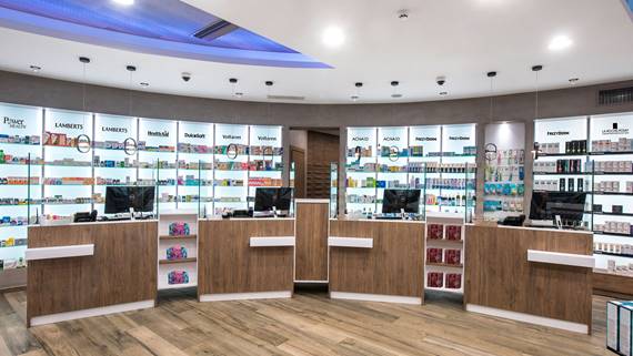 Ο κύριος χώρος, ευμεγέθης και επιβλητικός, ανοίγεται μπροστά στα μάτια μας δίνοντας την ευκαιρία να τον εξερευνήσουμε ελεύθερα. Η οργανωμένη και επιμήκης τοποθέτηση των προϊόντων με την κατηγοριοποίηση τους σε χωριστά ράφια, δημιουργεί τάξη και διευκολύνει την προώθησή τους. Στο τέλος του κεντρικού χώρου αντικρύζουμε τους πάγκους εξυπηρέτησης, με αισθητική που ενισχύει την γενική εικόνα του φαρμακείου. Η μοναδική ταυτότητα των χώρων και η δυναμική που αποπνέουν εντυπωσιάζουν με την πρώτη ματιά.