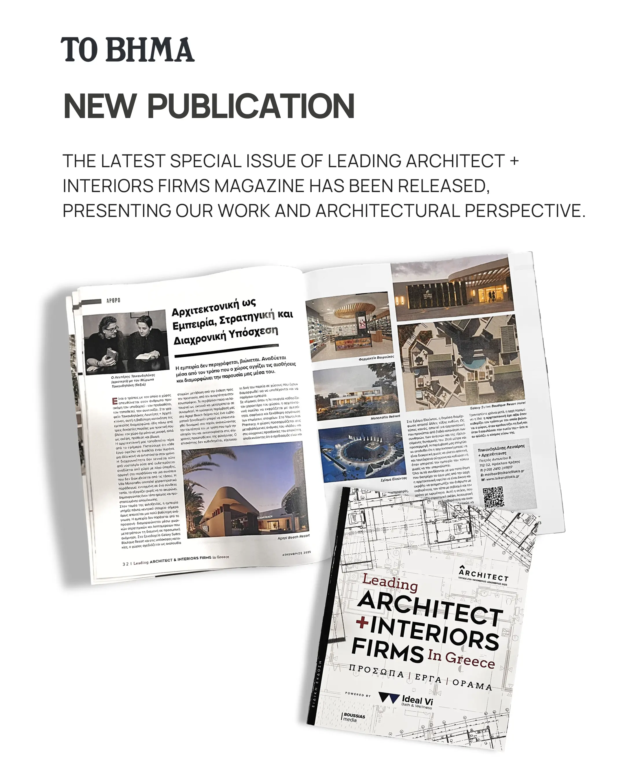 Με μεγάλη χαρά ανακοινώνουμε ότι το γραφείο μας παρουσιάζεται στην ειδική έκδοση Leading Architect & Interiors Firms in Greece, που κυκλοφόρησε την Κυριακή 14 Δεκεμβρίου με την εφημερίδα "ΤΟ ΒΗΜΑ" σε συνεργασία με τη Boussias Media.