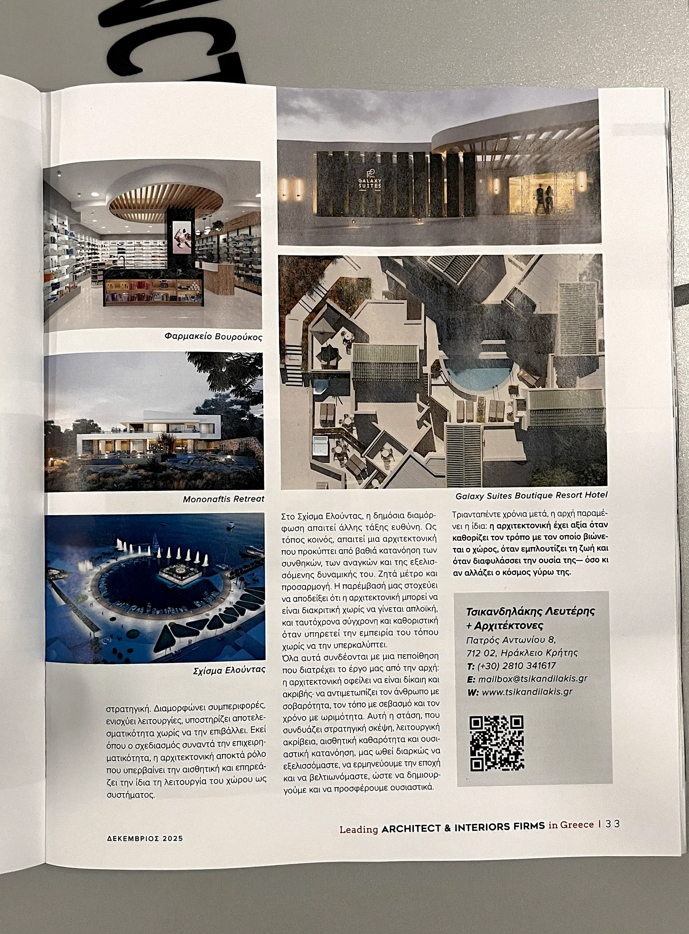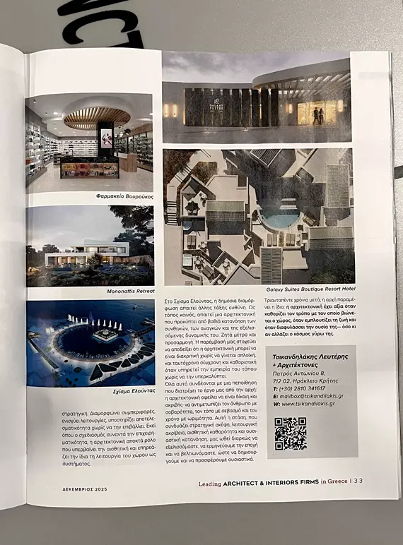 Η συμμετοχή μας αποτελεί σημαντική αναγνώριση της δημιουργικής μας πορείας και της αφοσίωσης της ομάδας μας να σχεδιάζει έργα υψηλής ποιότητας και αισθητικής. Μέσα από αυτήν την έκδοση είχαμε την ευκαιρία να προβάλουμε το έργο μας και να μοιραστούμε τη δημιουργική μας πορεία με το ευρύτερο κοινό.